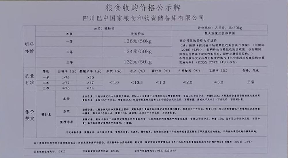 為認真貫徹國家糧食收購政策,全面落實省、市決策部署,踐行糧食安全黨政同責責任,充分發(fā)揮行業(yè)主體責任,做好秋糧收購工作,切實保護種糧農(nóng)民利益。現(xiàn)將四川巴中國家糧食和物資儲備庫有限公司2025年秋糧收購相關信息公示如下: